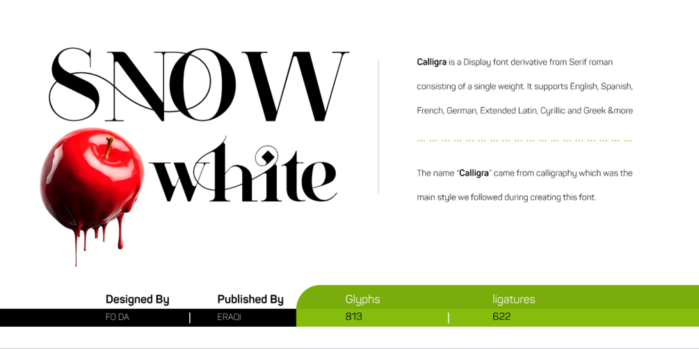 Calligra is a single weight display font derived from a serif roman. It works well for headlines and can be used also well in text. It supports English, Spanish, French, German, Extended Latin, Greek and more. The name Calligra came from calligraphy which was the main style we followed during creating this font. Main Features: • 813 glyphs • 622 ligatures • 29 “Number” ligatures • Support for many languages • Perfect for logos and headlines • Latin support expanded