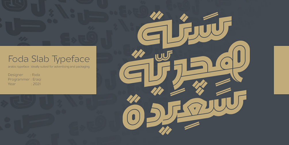 Foda Slab is a powerful Arabic slab typeface that has two styles : Regular and Hollow. With 886 glyphs Foda Slab has many ligatures which makes it suitable for headlines and other different graphic contexts.