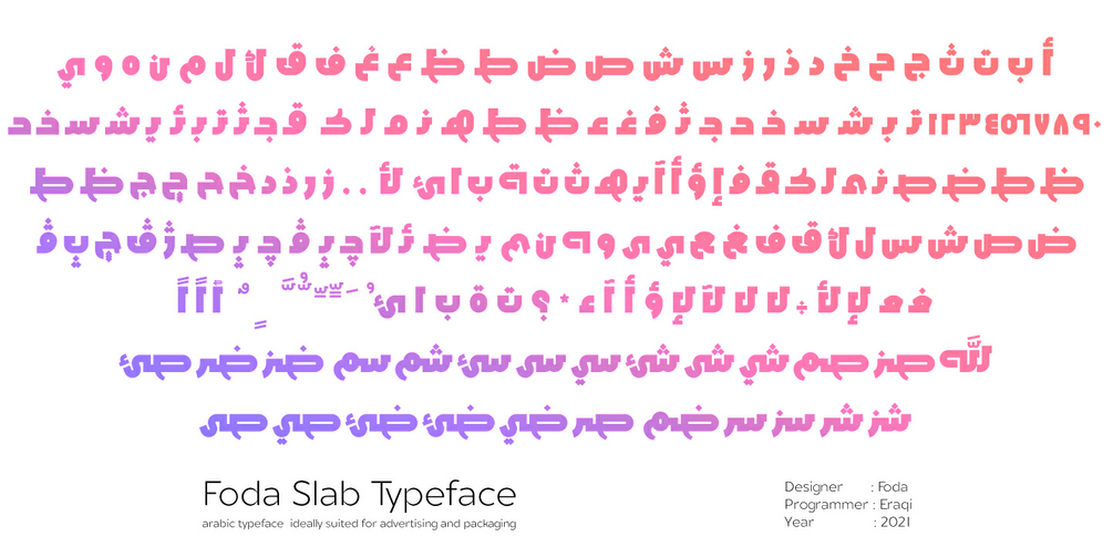 Foda Slab is a powerful Arabic slab typeface that has two styles : Regular and Hollow. With 886 glyphs Foda Slab has many ligatures which makes it suitable for headlines and other different graphic contexts.